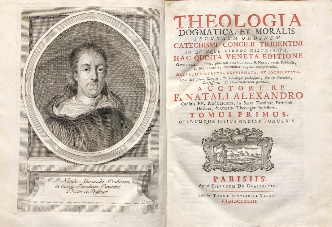 THEOLOGIA DOGMATICA, ET MORALIS SECUNDUM ORDINEM CATECHISMI CONCILII TRIDENTINI IN QUINQUE LIBROS DISTRIBUTA, HAC QUINTA VENETA EDITIONE Omnium accuratissima, plurimis accessionibus, & Notis, variis Epistolis, & Monumentis, Appendice duplici comprehensis, AUCTA ILLUSTRATA, CONFIRMATA, ET LOCUPLETATA. Opus non solum Clericis, et Theologis quibusque, sed et Parochis, Confessariis, et Concionatoribus perutile. AUCTORE R. P. F. NATALI ALEXANDRO Ordinis FF. Prædicatorum, in Sacra Facultate Parisiensi Doctore, & emerito Theologiæ Professore.
