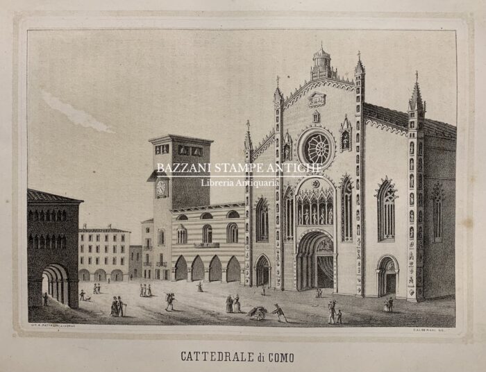 Descrizione: Litografia tratta da un soggetto di C. Alderani e inserita nell’opera “Le cento città d’Italia. Descritte ed illustrate co’ loro celebri Monumenti” stampata a Livorno dalla Tipografia La Minerva di B. Ortalli nel 1874. In basso si legge il titolo completo “Cattedrale di Como”. Bel foglio.