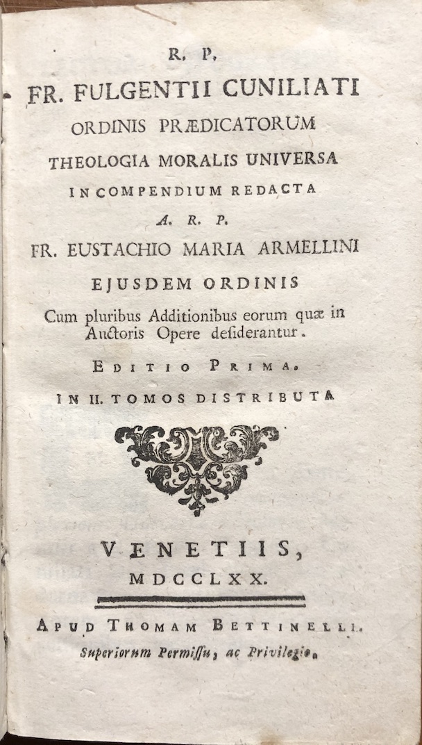R. P. FR. FULGENTII CUNILIATI ORDINIS PRÆDICATORUM THEOLOGIA MORALIS UNIVERSA IN COMPENDIUM REDACTA A. R. P. FR. EUSTACHIO MARIA ARMELLINI EJUSDEM ORDINIS Cum pluribus Additionibus eorum quæ in Auctoris Opere desiderantur. EDITIO PRIMA. IN II TOMOS DISTRIBUTA.