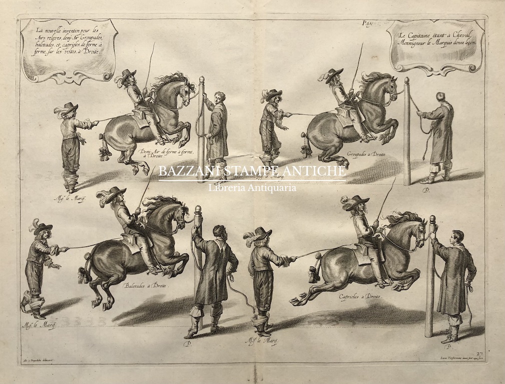 Incisione da un soggetto di Abraham van Diepenbeeck, tratta dalla seconda edizione dell’opera “Méthode et invention nouvelle de dresser les chevaux” di William Cavendish (1592 – 1676, Duca di Newcastle) stampata a Londra da Jean Brindley nel 1737 ed illustrata con le stesse tavole della prima edizione del 1658.