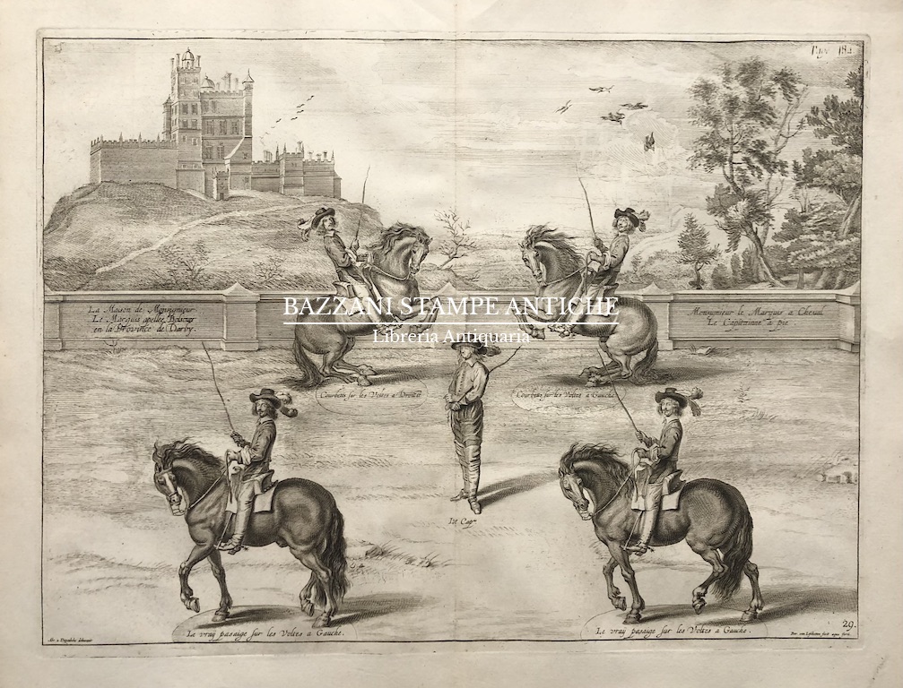 Incisione da un soggetto di Abraham van Diepenbeeck, tratta dalla seconda edizione dell’opera “Méthode et invention nouvelle de dresser les chevaux” di William Cavendish (1592 – 1676, Duca di Newcastle) stampata a Londra da Jean Brindley nel 1737 ed illustrata con le stesse tavole della prima edizione del 1658.