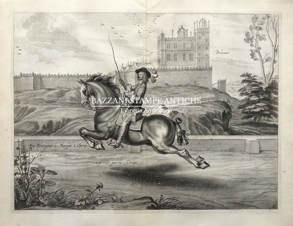 Descrizione: Incisione da un soggetto di Abraham van Diepenbeeck, tratta dalla seconda edizione dell’opera “Méthode et invention nouvelle de dresser les chevaux” di William Cavendish (1592 – 1676, Duca di Newcastle) stampata a Londra da Jean Brindley nel 1737 ed illustrata con le stesse tavole della prima edizione del 1658.