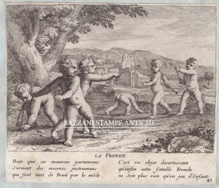 Descrizione: Incisione tratta dalla raccolta “Les jeux et plaisirs de l’enfance”. Rifilata e montata anticamente su un foglio azzurro.