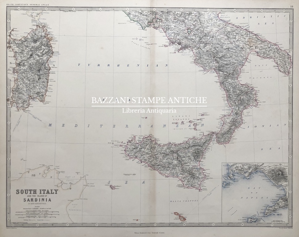 Descrizione: Litografia tratta dall’atlante “The Royal Atlas of Modern Geography” stampato ad Edimburgo e Londra da William Blackwood and Sons nel 1861 (prima edizione). Bella carta dell’Italia meridionale con un ingrandimento del Golfo di Napoli nell’angolo in basso a destra. Bel foglio con traccia di piega centrale.