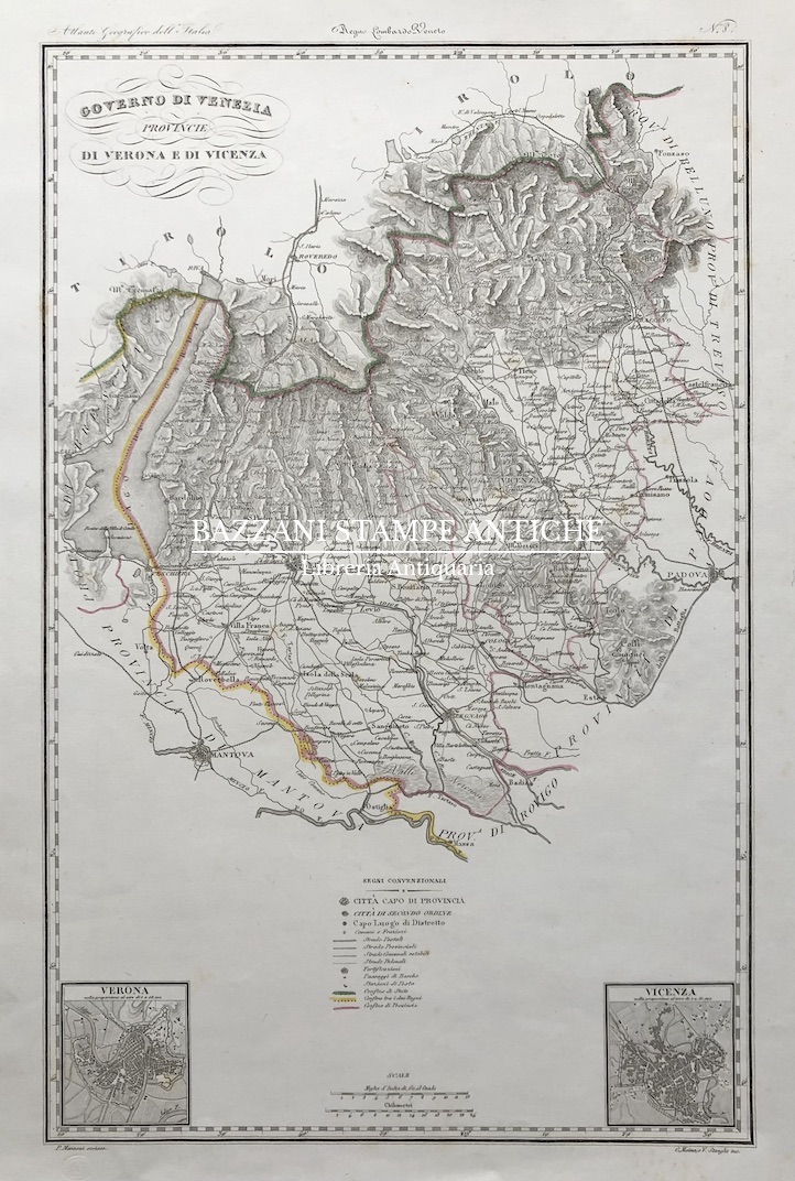 Bella carta delle province di Verona e Vicenza, ricca di dettagli. Sono segnate, per esempio, le Strade Provinciali, Comunali, Postali con le Stazioni di Posta, oltre all’impianto idrografico e, a colori, i confini. Negli angoli inferiori, inoltre, sono presenti le piante delle due città.