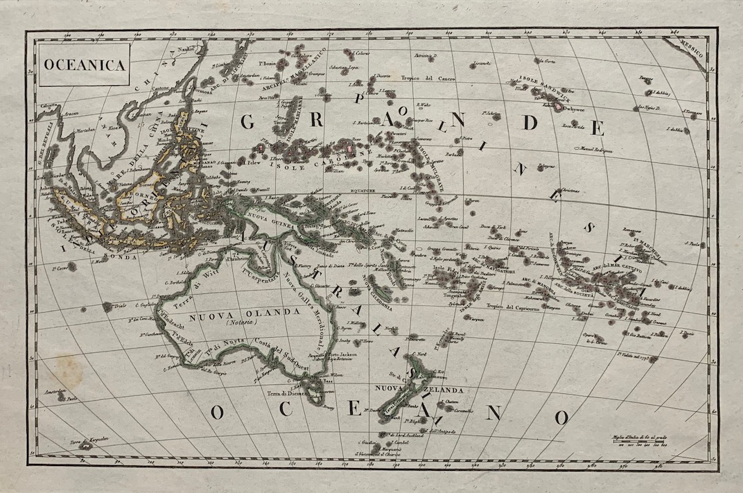 Descrizione: Carta tratta dall’atlante “Nuovo Atlante di Geografia Moderna compilato da Carlo Rossari ad uso delle Scuole Ginnasiali sulle tracce de’ più celebri ed accreditati Geografi moderni dietro revisione dell’Istituto Geografico Militare secondo le norme dei relativi libri di testo superiormente prescritti” stampato a Milano nel 1822. Bel foglio, piccolo foro nel margine inferiore che non interessa la parte incisa.