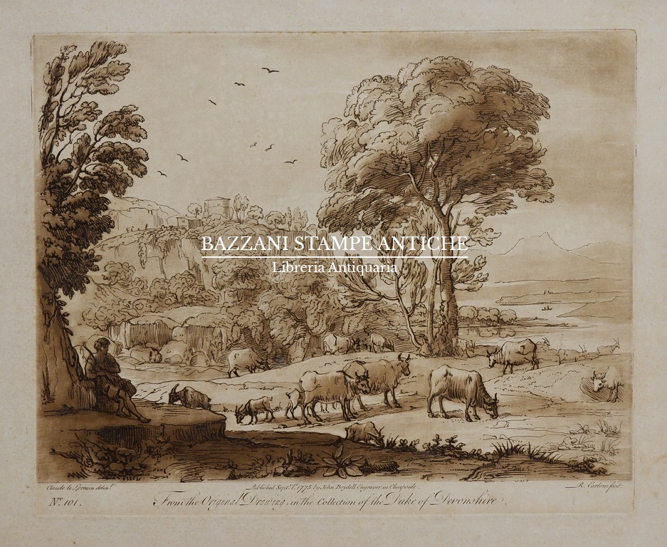 Descrizione: Incisione tratta da un soggetto di Claude Lorrain, e facente parte della collezione “Liber Veritatis or a Collection of Two hundred prints after the original designs of Claude Le Lorrain in the collection of his grace the Duke of Devonshire, executed by Richard Earlom…” (prima tiratura del 1777 pubblicata da Boydell). La stampa è la numero 101 della collezione “Liber Veritatis” di Lorrain. Bel foglio.
