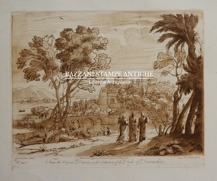 Descrizione: Incisione tratta da un soggetto di Claude Lorrain, e facente parte della collezione “Liber Veritatis or a Collection of Two hundred prints after the original designs of Claude Le Lorrain in the collection of his grace the Duke of Devonshire, executed by Richard Earlom…” (prima tiratura del 1777 pubblicata da Boydell). La stampa è la numero 125 della collezione “Liber Veritatis” di Lorrain. Bel foglio.