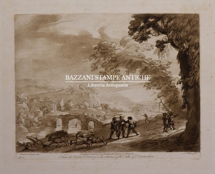 Descrizione: Incisione tratta da un soggetto di Claude Lorrain, e facente parte della collezione “Liber Veritatis or a Collection of Two hundred prints after the original designs of Claude Le Lorrain in the collection of his grace the Duke of Devonshire, executed by Richard Earlom…” (prima tiratura del 1777 pubblicata da Boydell). La stampa è la numero 3 della collezione “Liber Veritatis” di Lorrain. Bel foglio.