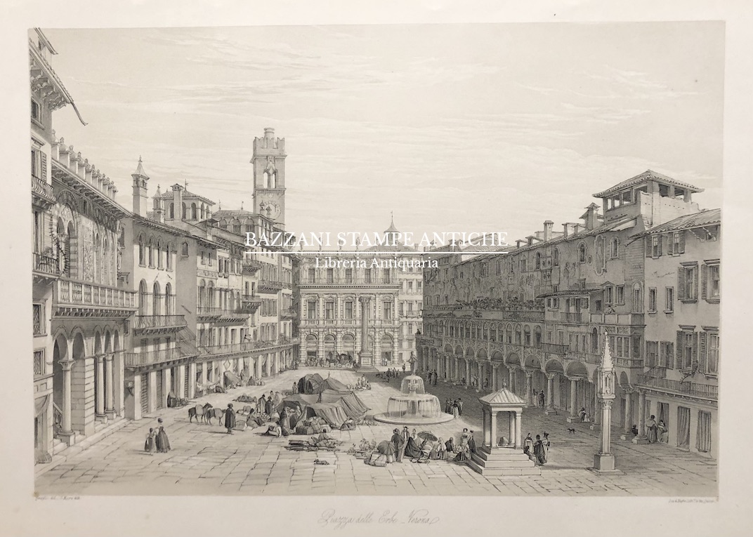 Splendida veduta animata di Piazza delle Erbe, sullo sfondo si notano Palazzo Maffei e la Torre del Gardello. Bel foglio.