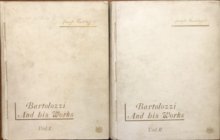 Due volumi in 4° (295 x 220 mm), pagine: (2b), (10), 211, (8), (2b), 5 tavole fuori testo e una nel frontespizio; (4b), (6), 152, (90b, intercalate nel testo), (5), (1b), (2), (2b), 6 tavole fuori testo e una nel frontespizio. Le tavole sono state tirate dalle lastre originali. Legatura editoriale in pergamena rigida con titoli in oro sui piatti e sui dorsi, cucitura esterna in spago dorato nelle cerniere. PRIMA EDIZIONE. Resoconto biografico e descrittivo della vita e della carriera di Francesco Bartolozzi (1728 – 1815) con alcune osservazioni sulla domanda attuale e sul valore delle sue stampe, il modo per scoprire le moderne impressioni dalle lastre logore e per riconoscere le impressioni colorate, insieme a una lista di 2.000 opere catalogate. Ottimo stato.