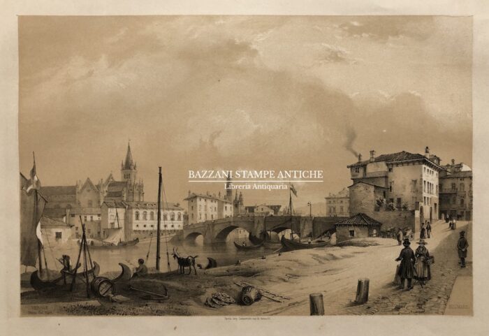 Descrizione: Litografia tratta dall’albo “Pittoresk resetur fran Stockolm till Neapel…” di K. J. Billmark stampato a Stoccolma nel 1852. In basso a sinistra si legge il titolo “VERONE Ponte del Navi”, in basso a destra la firma “Billmark”, al centro “Paris, imp. Lemercier rue de Seine, 55”. Bel foglio.